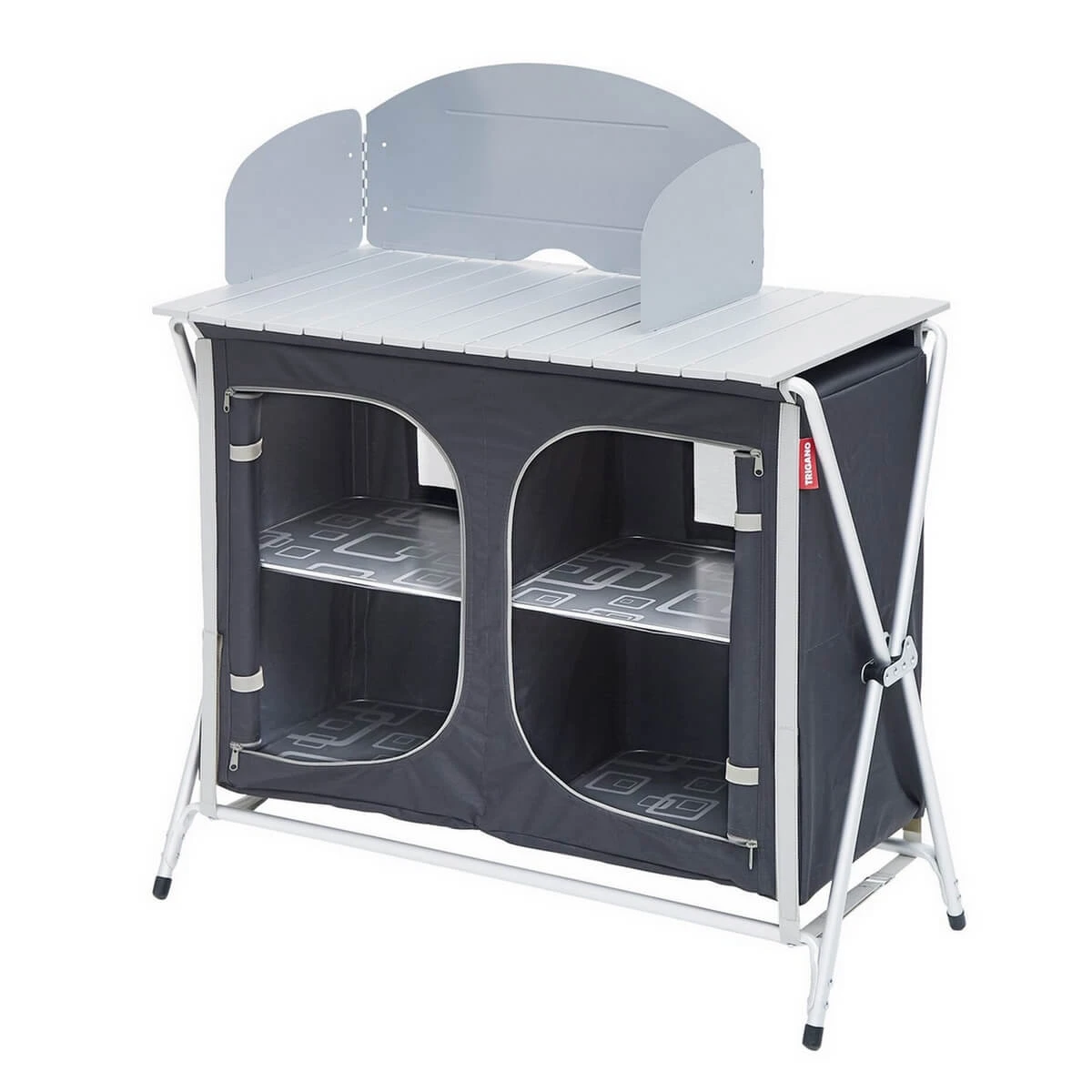 Meuble cuisine camping pliant avec 4 Ă©tagères cerclĂ©es d’aluminium, un plateau de travail et un pare-feu intĂ©grĂ©.